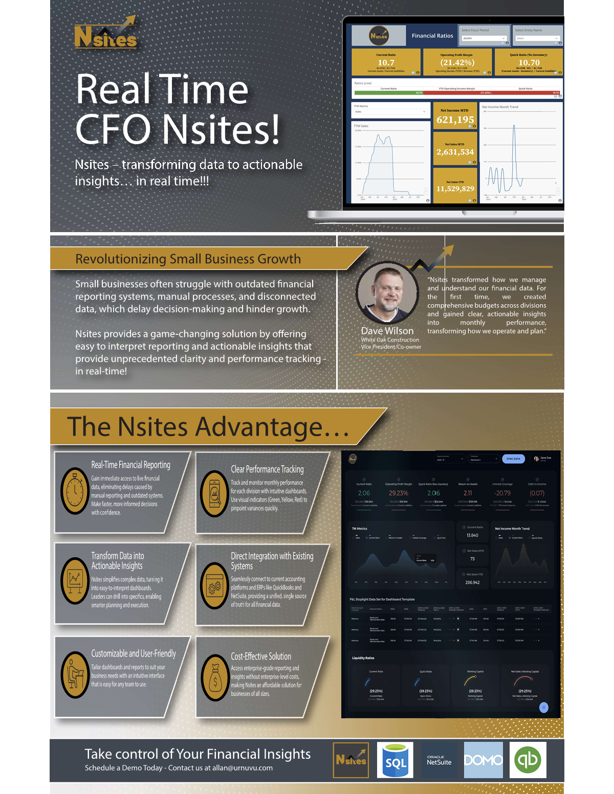 Our difference hinges on our nearly 30 years of experience across corporate finance and manufacturing operations which leverage lean and six sigma principles. These experiences, coupled with our approach to processing data into meaningful information, allow us to provide useful insights to our clients quickly by leveraging our proprietary Nsites application.